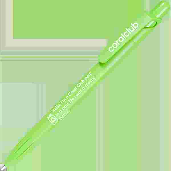 Bolígrafo con mecanismo de botón hecho de material PET-RECYCLED en el que pone " ¡Hola, soy un bolígrafo de Coral Club! En mi vida anterior, era un envase de plástico".