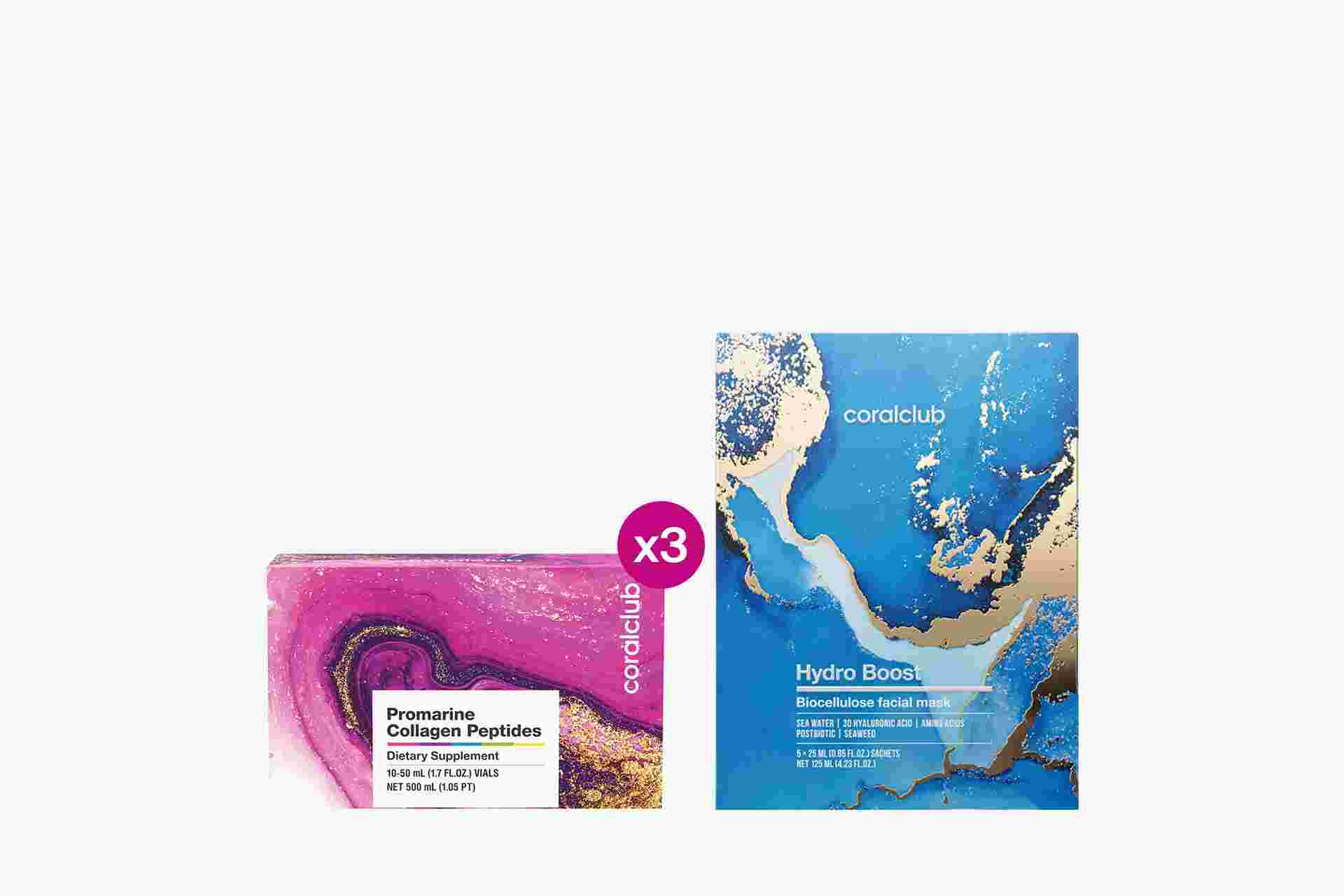 Pack Promarin Collagen Peptides (curso de 1 mes) y mascarillas faciales de biocelulosa Hydro Boost (5 sobres)