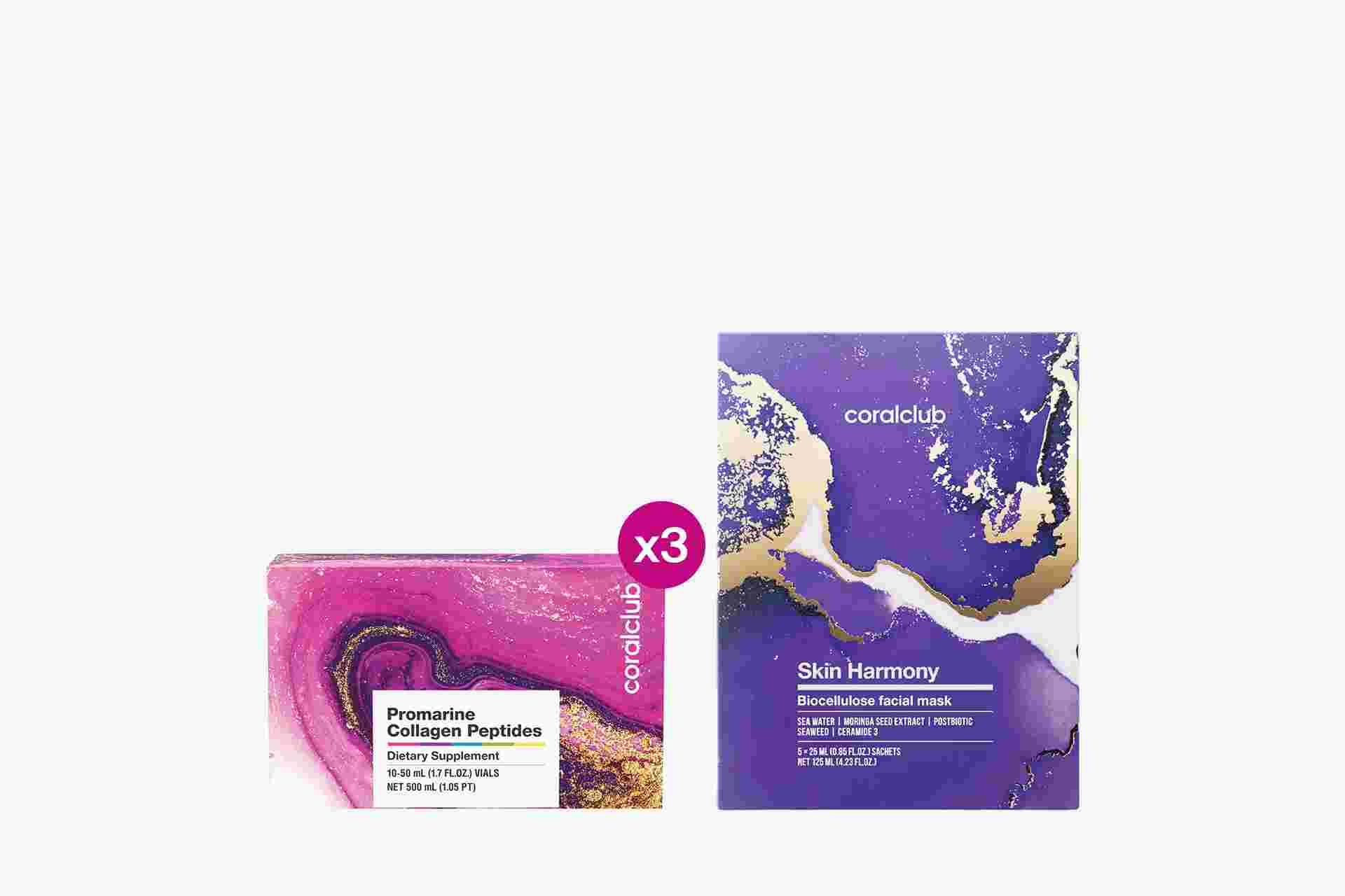 Pack Promarin Collagen Peptides (curso de 1 mes) y mascarillas faciales de biocelulosa Skin Harmony (5 sobres)